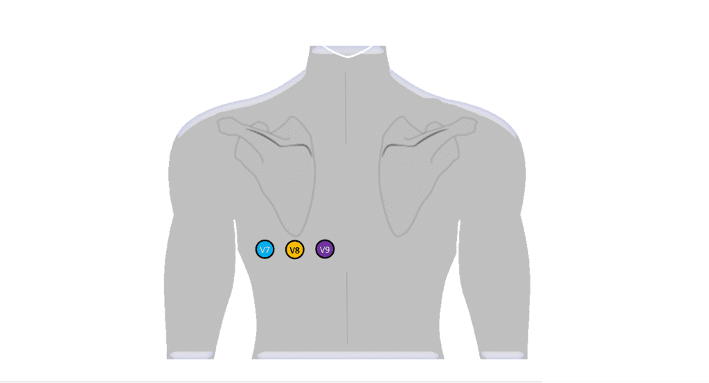As derivações V7, V8 e V9 são feitas no dorso do paciente, no mesmo nível horizontal de V6 (5º espaço intercostal). Veja a posição de cada uma: