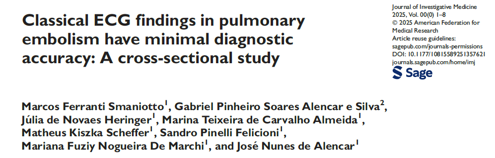 - Smaniotto MF, Alencar E Silva GPS, Heringer J de N, Almeida MT de C, Scheffer MK, Felicioni SP, et al. Classical ECG findings in pulmonary embolism have minimal diagnostic accuracy: A cross-sectional study. J Investig Med Off Publ Am Fed Clin Res. 30 de junho de 2025;10815589251357621.