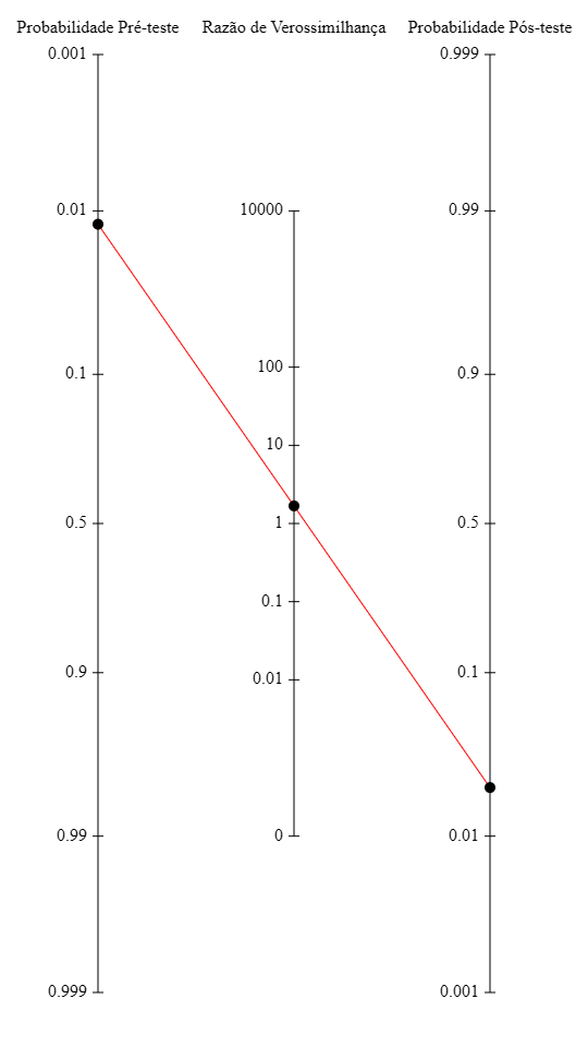 Imagine, por exemplo, um paciente idoso do sexo masculino, com histórico de hipertensão e dislipidemia, que chega ao pronto-socorro com dor torácica, dispneia, hemoptise e uma frequência cardíaca de 95 bpm. Numa avaliação clínica inicial, pelo escore de Wells, tal paciente teria um escore de 1,5 pontos devido à hemoptise e, consequentemente, probabilidade pré-teste de aproximadamente 1,3% para TEP. Ao ECG, tem-se apenas o clássico padrão S1Q3T3 (LR+ = 2,07) como alteração eletrocardiográfica notável para TEP. Dessa forma, a probabilidade pós-teste para essa enfermidade após realizado o ECG aumentaria para apenas 2,7%; conforme o nomograma de Fagan abaixo (gerado no site https://ferramentasmbe.netlify.app/):