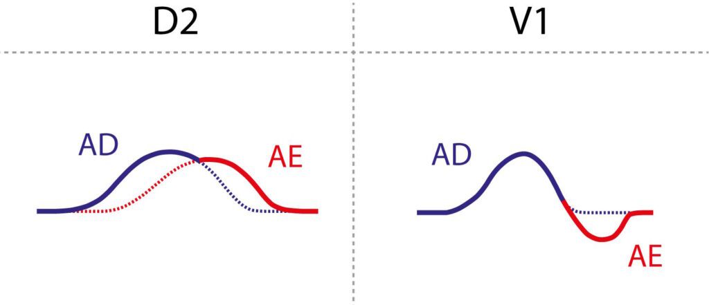 Vale ressaltar que para este critério funcionar, é necessário que o vetor V1 esteja bem-posicionado no quarto espaço intercostal e não no segundo espaço intercostal. Ele fica com essa onda plus-minus avantajada na porção minus pois como o átrio esquerdo é posterior em relação ao átrio direito, quando o estímulo passa para o feixe de Bachmann, e como agora tem mais massa atrial, o vetor aumenta seu valor, gerando esse minus aumentado.
